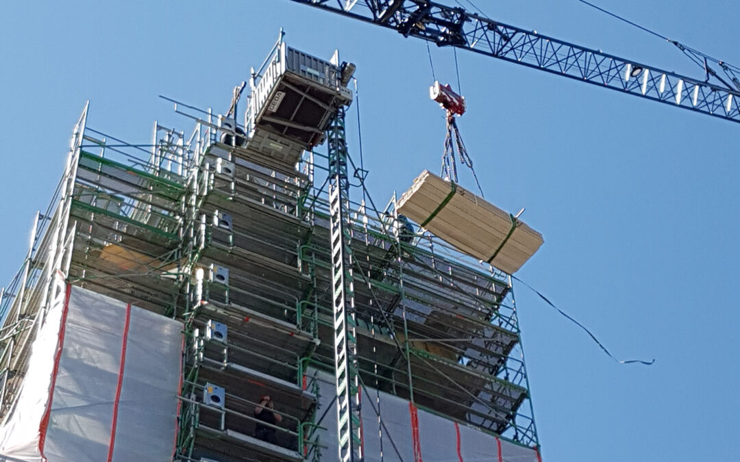 Am Montag wurde bewiesen, dass das geht. Ein riesiger Autokran der Firma roll aus Crailsheim hob die schweren Bauteile der Schallläden und die für die Glocken erforderlichen Klöppel und Eichenjoche mit Leichtigkeit auf den Turm. Jetzt kann oben weiter gebaut werden. Weiter gebaut wird auch das Gerüst bis zur Turmspitze zum Kreuz. Dann kann die Standfestigkeit des Kreuzes geprüft werden um gegebenenfalls die erforderlichen Sanierungsarbeiten vorzunehmen. Fortsetzung folgt!