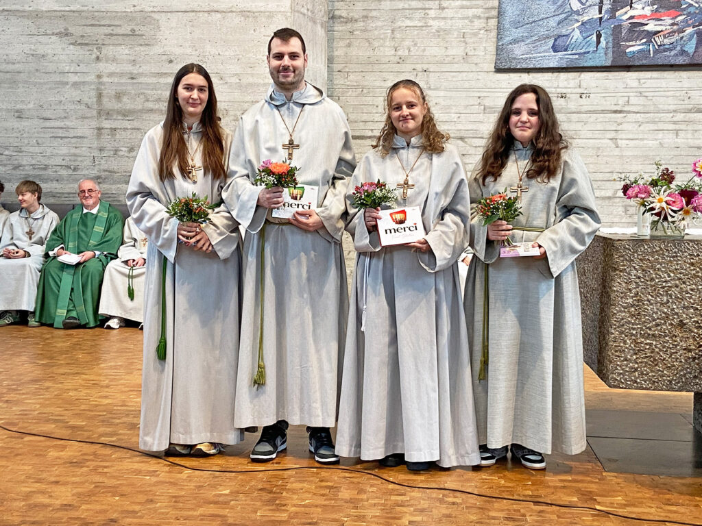 Für ihren 10-jährigen Dienst bei den Minis wurde Marilena Dörrer geehrt, und die Gemeinde spendete ihr großen Applaus. Nach 16 (!) Jahren wurde Moritz Kirschinger aus der Gemeinschaft verabschiedet, mit ihm Laura Hauff (11 Jahre), Laura Hetper (9 Jahre) und Caitlin Kohout (9 Jahre), die künftig Ministrantin in St. Bonifatius sein wird.