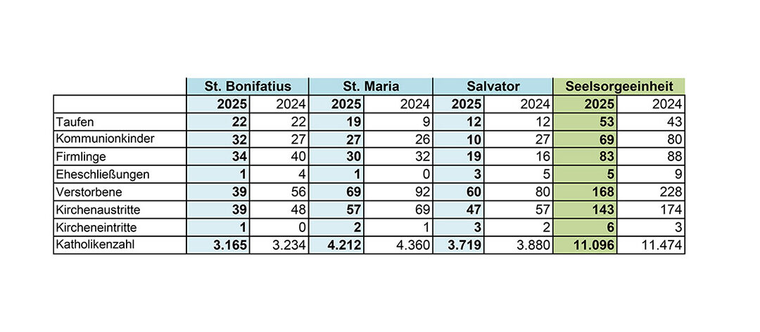 Auf den ersten Blick gibt es zur Statistik 2025 nicht viel Neues zu berichten: Unsere Gemeinden werden kleiner. Die Zahl der Kirchenaustritte ist leicht rückläufig und die Zahl der Verstorbenen weiterhin hoch. Trauungen nehmen weiterhin stark ab, wobei Aalen als Trauungsort nicht sehr beliebt ist. Viele Paare wählen für ihre Hochzeit einen Ort außerhalb unserer Seelsorgeeinheit. Ein neuer Trend ist allerdings, dass die Familien ihre Verstorbenen, die bis zu ihrem Tod zur Gemeinde gehörten, nicht mehr katholisch beerdigen lassen. So wurden 6 Gemeindemitglieder ganz ohne Feier, 4 von evangelischen Geistlichen und 21 von freien Rednern bestattet. Hier müssen wir nachforschen, ob dieser Trend ein allgemeiner ist oder nur mit unserer Gemeinde zu tun hat. Dennoch habe ich den Eindruck, dass z.Z. die Stimmung bei der Kerngemeinde gut ist, auch wenn der Blick in die Zukunft große Fragen aufwirft.
