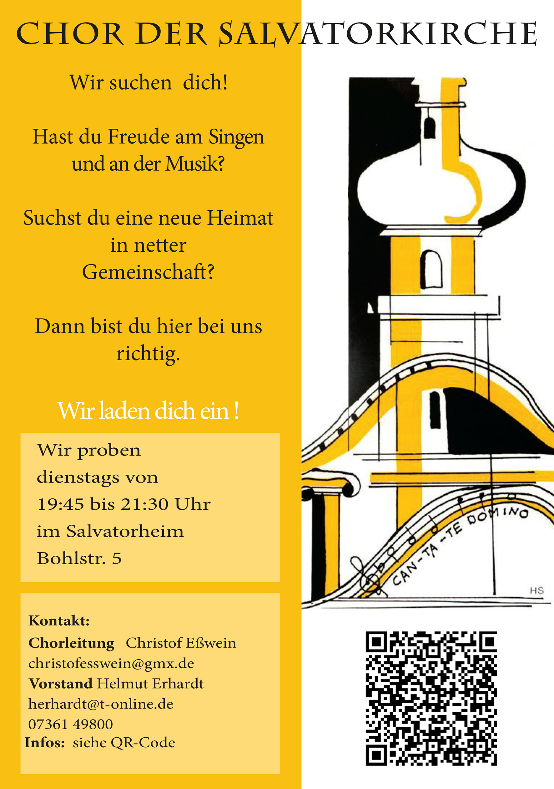 Im Juli 2025 hat Herr Christof Eßwein die Leitung des Chores der Salvatorkirche übernommen. Er hat an der Musikhochschule in Stuttgart sein Diplom als Musiklehrer erhalten. Ebenso hat er im Schwerpunk Pop und Jazz die künstlerische Prüfung für das Lehramt an Gymnasien abgelegt. Da er bereits viel Erfahrung in der Chorleitung mit weltlichen und kirchlichen Chören vorweisen kann, ist er für unseren Chor bestens geeignet um ihn musikalisch weiter zu entwickeln. Wir laden sie ein, diese Entwicklung mit uns gemeinsam in unserer Chorgemeinschaft zu erleben. Wir laden sie dazu herzlich ein.