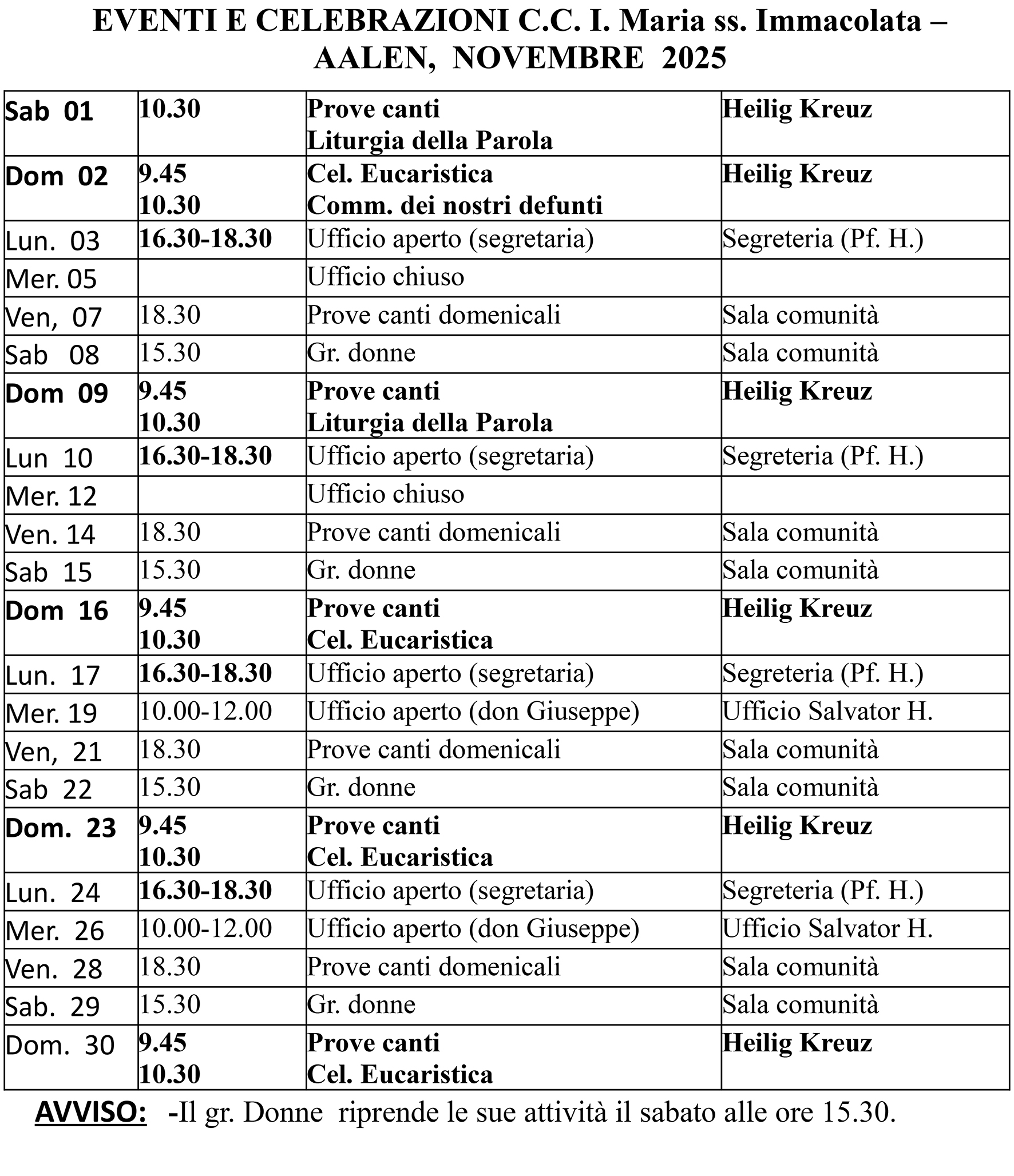 Jeden Sonntag findet die Heilige Messe in italienischer Sprache um 10.30 Uhr im Heilig Kreuz, Aalen-Hüttfeld statt.